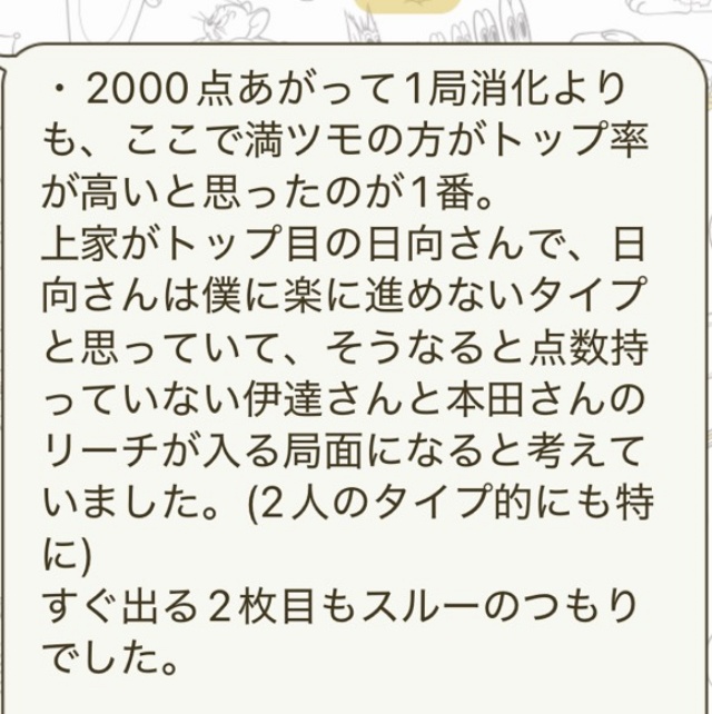 南3局には全員テンパイのめくりあいに勝利し、日向から5200をアガって、これで南4局伊達との一騎打ちへ。