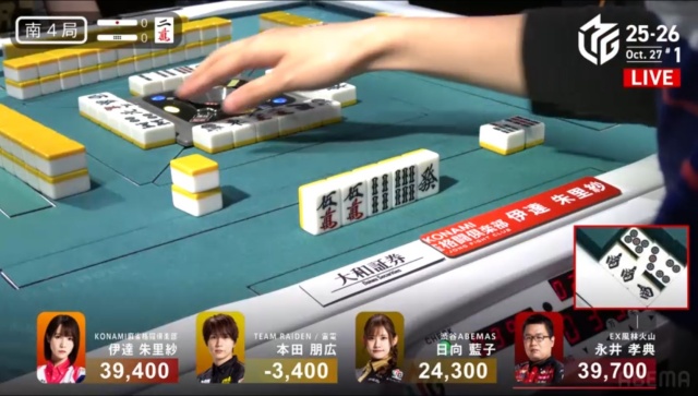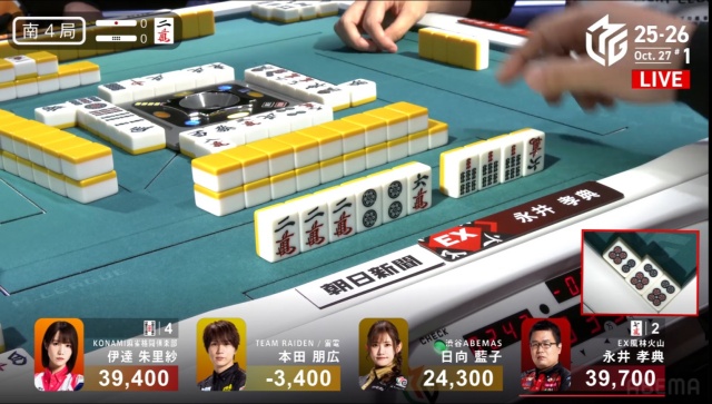 この瞬間に、この局永井がアガればトップがほぼ手中に収まることが確定。