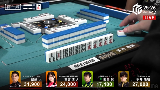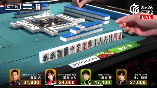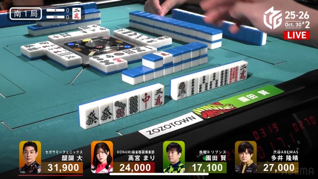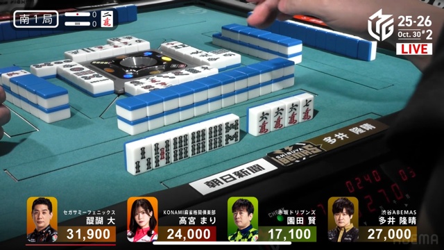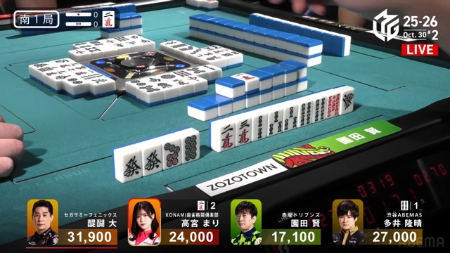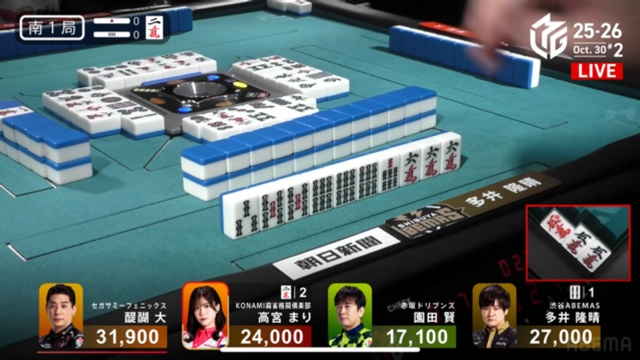 11巡目、高宮からリーチが! 待ちはドラの 、この巡目で山に残り2枚は期待が持てる。