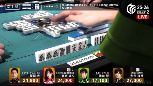 プッシュのあと、多井が無筋の をツモり手が止まる。