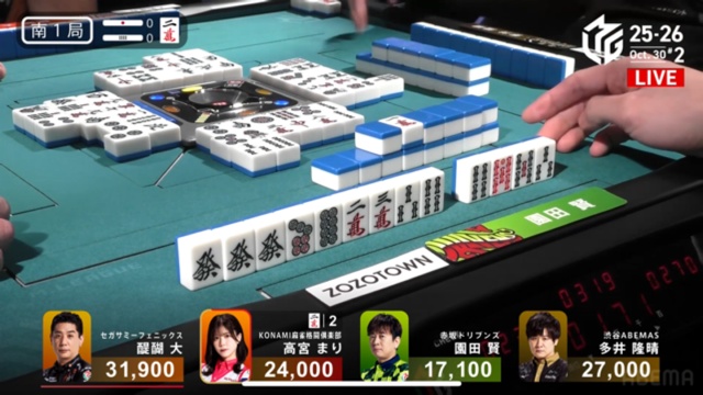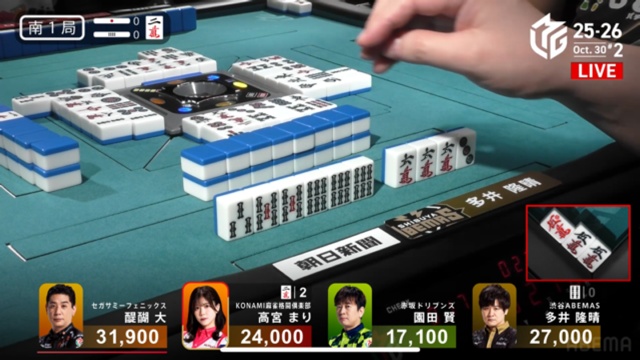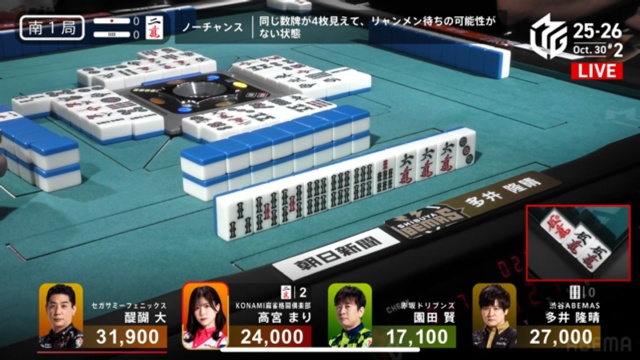 石橋の解説通り、園田は多井の プッシュでテンパイ濃厚だと考えていたという。