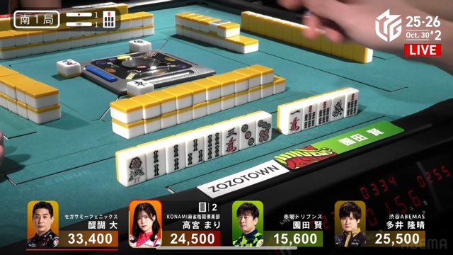 ラス目の親・園田がテンパイ。ドラ の重なりよりもとにかく和了優先の選択。