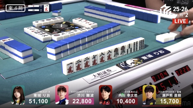 リーチツモピンフ赤裏。4000オールでまずは東城が先制。