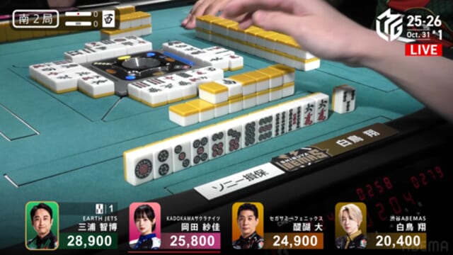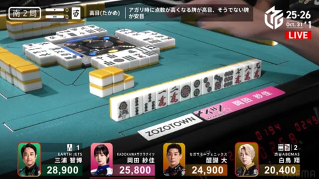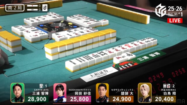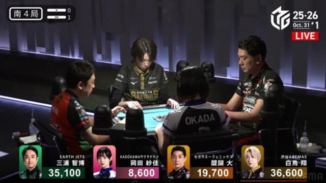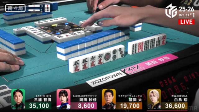 「ねえねえ」と何かに気づいた様子の土田さん。この場面、岡田が跳満ツモを決めると、白鳥が親被りによりトップを陥落、三浦と順位が逆転するのだ。
