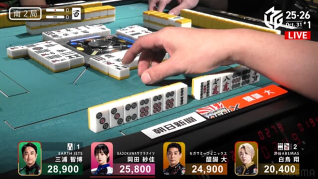 ジュンチャン三色も見えていた岡田が、2軒リーチに囲まれながらも無筋の
