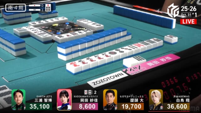 さらに、オーラス南4局1本場。0本場で白鳥が岡田から12000を直撃し、微差ながら三浦をかわしてトップ目に立つ状況。