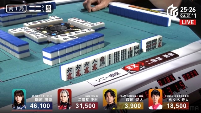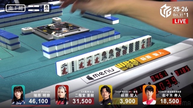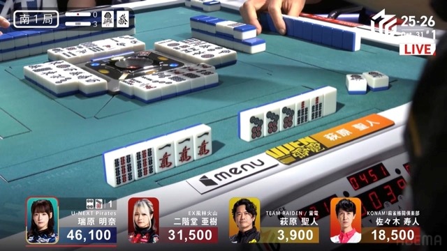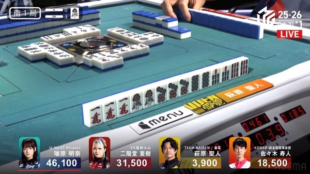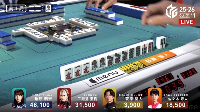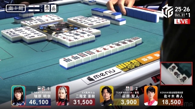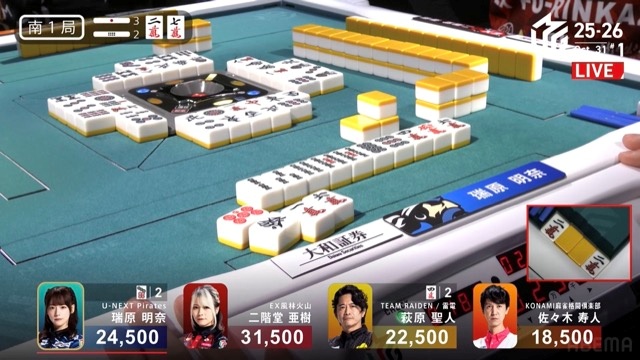 瑞原に18,000点を払った直後の南1局3本場、ドラは
