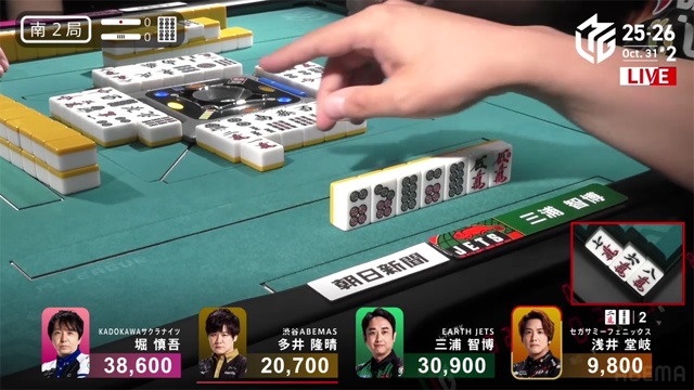 1試合目でシーズン初トップを決め連投となった三浦は、前局でチートイドラドラの1本場、6700点を堂岐から出アガっている。