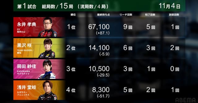 試合は、序盤から連続ハネマンを決めて大逃げを打った永井の快勝。個人4勝目を獲得し、風林火山が首位からさらにポイントを伸ばした。