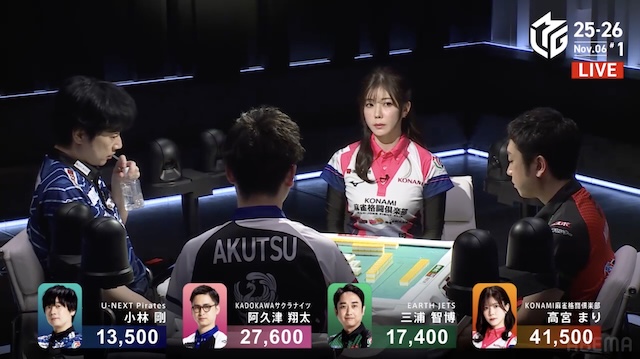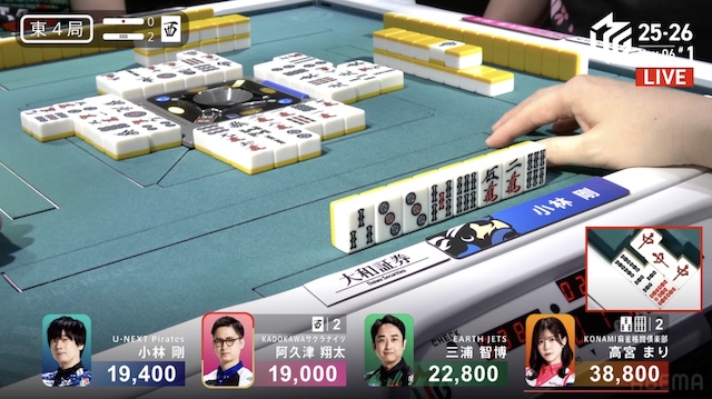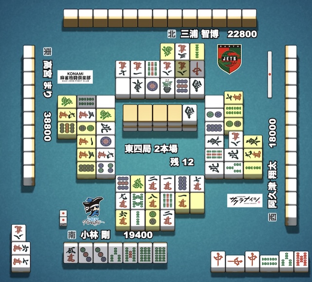 小林は高打点のツモアガリに巻き込まれてラスを食うことになったが、もし不用意に前に出ていればさらなる甚大な被害をこうむることになりかねない試合でもあった。長いリーグ戦において、無用な深手を追うと後の戦略にも影響しかねない。