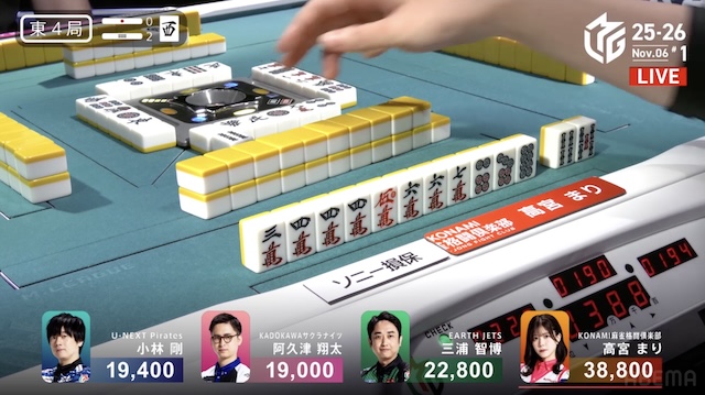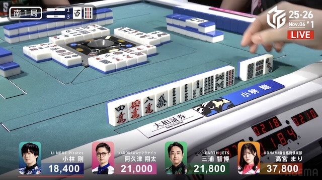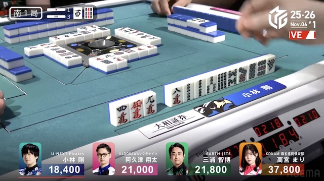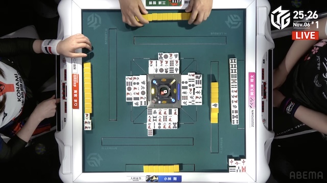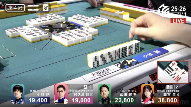 ただ、小林がテンパイする前に高宮の仕掛け、阿久津のリーチが入り、小林は守備に回る。