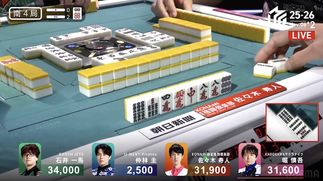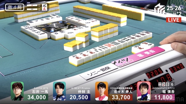 南4局、堀のリーチに対し、仲林が前巡に切っていた高目のロン牌【8ピン】をつかんで一発放銃。今シーズンは苦戦している仲林だが、それを象徴するような巡りの悪さで堀に18000を打ち上げ、トップ争いは三つ巴に。
