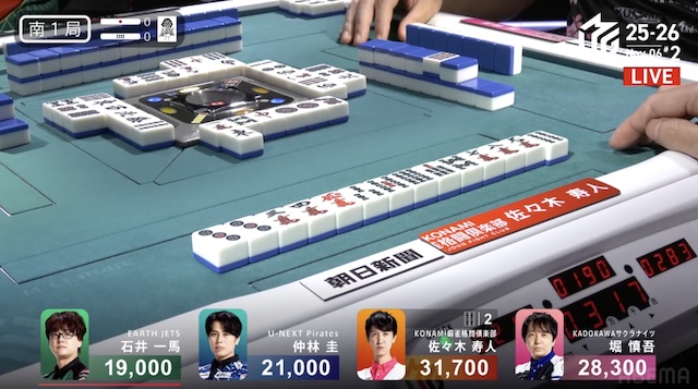この試合、一馬は序盤から劣勢が続いた。東1局東2局と連続で3900を放銃するなど失点を重ね、