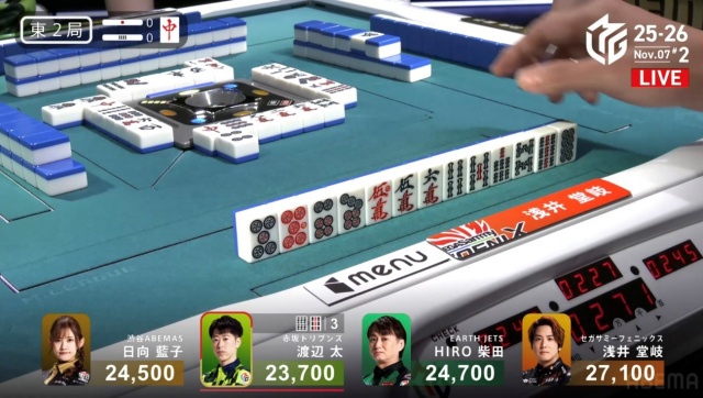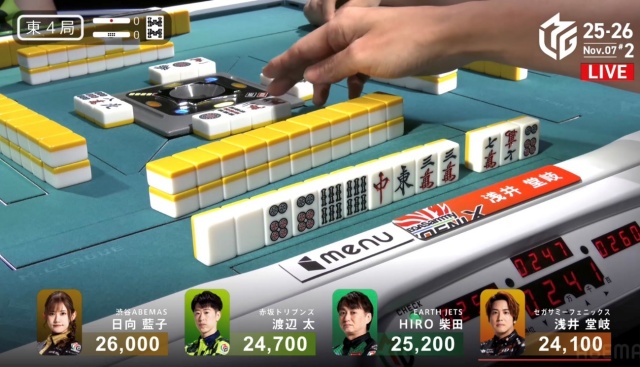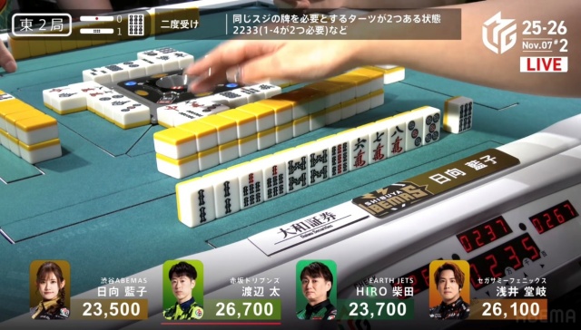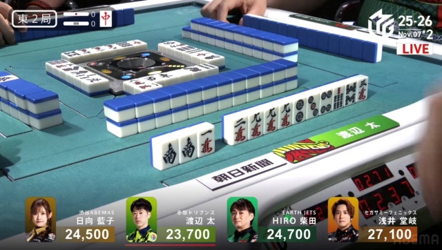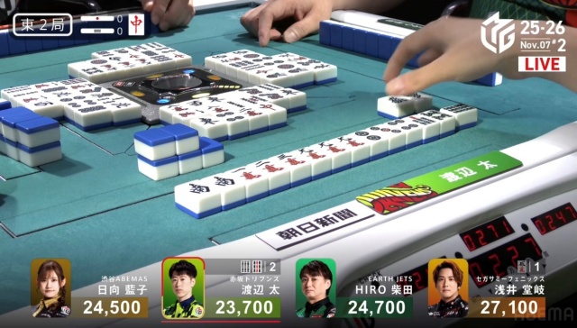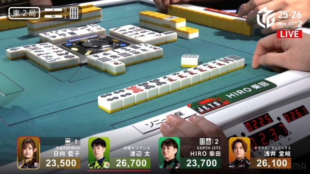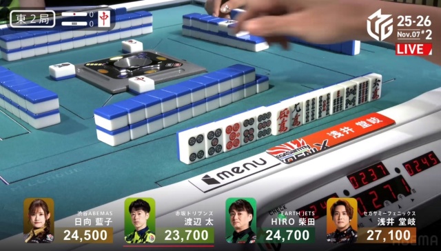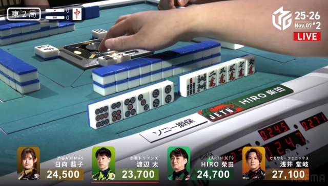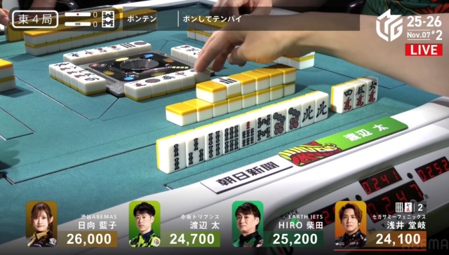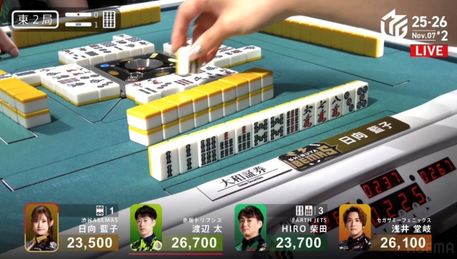 北家の日向が先制リーチを放つ。