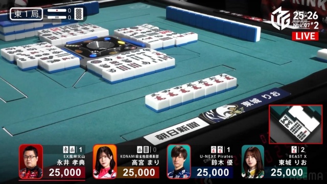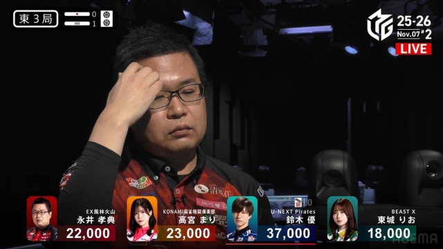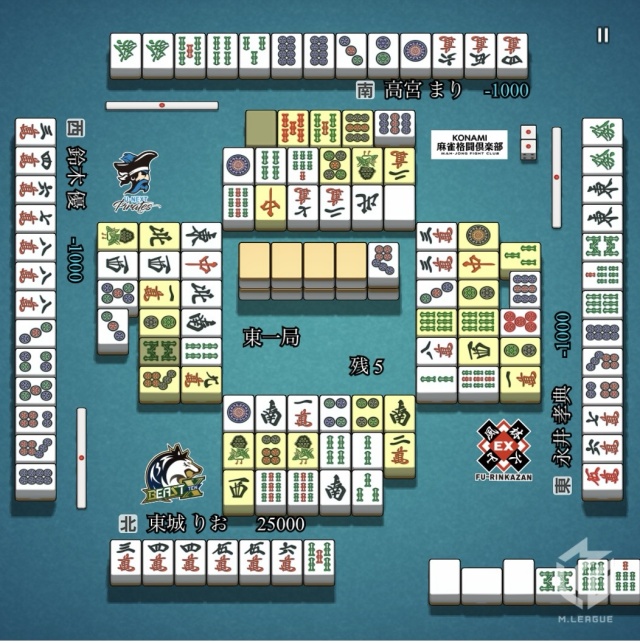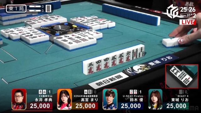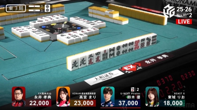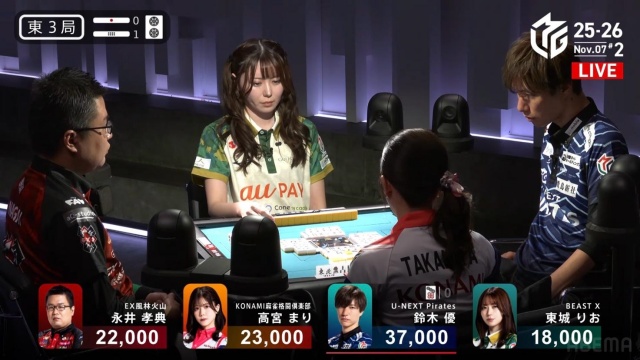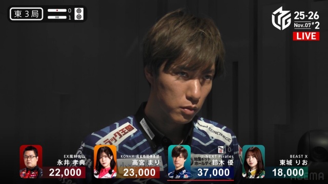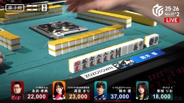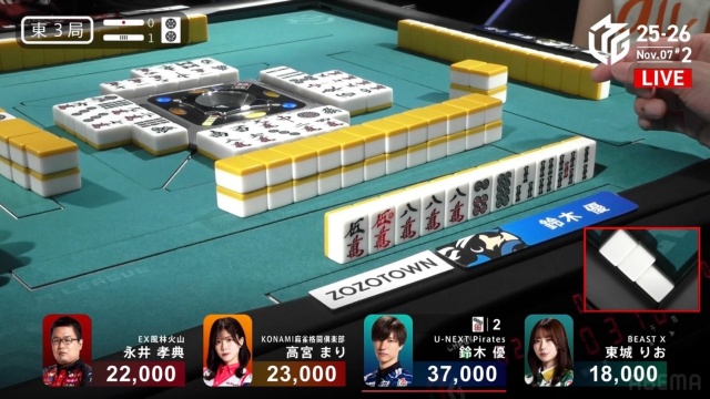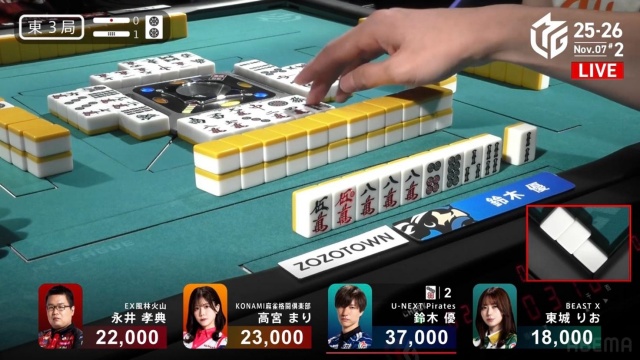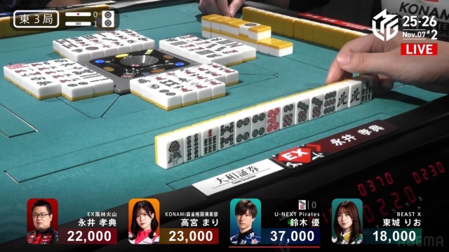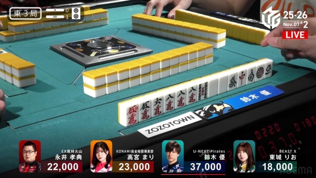 東3局に東城から親のマンガン12,000を仕留め、一歩抜け出した親番の優。ここからはもう、卓上の“空気”そのものを握りしめていく。ここではその流れを形作った2局を紹介したい。
