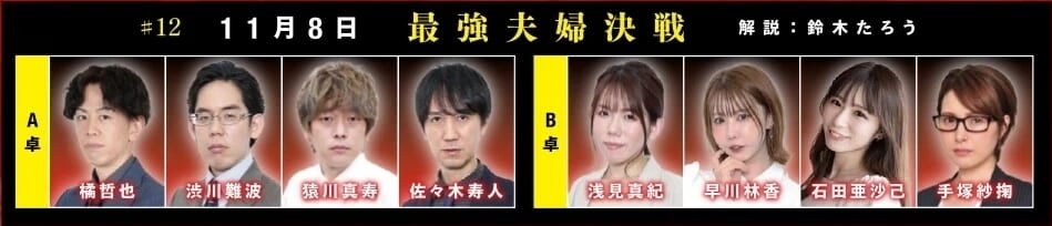 今回招待されたのは、8名というか4組。共に麻雀プロとして活躍し、実績や知名度に秀でた夫婦による対決だ。キャッチーかつ斬新、そしてメンバーの顔ぶれも豪華となれば、注目も集まろうというもの。