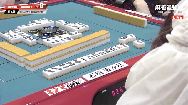 東3局は石田が浅見の高打点リーチに競り勝つリーチツモピンフ裏、1300-2600のアガリ。