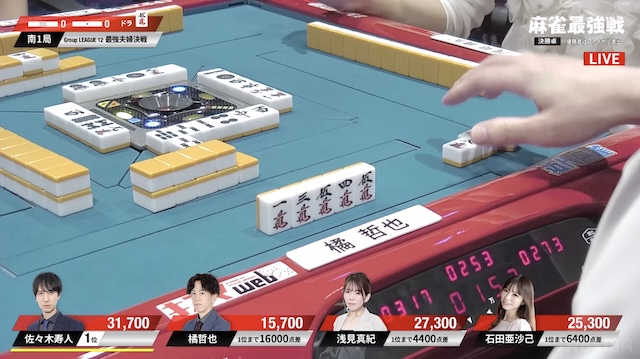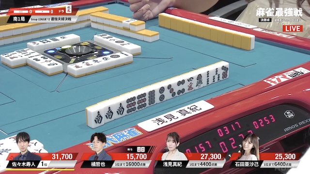 東4局は浅見が石田から3200の出アガリ。各者がいい感じにバチバチやりあいながら、試合はテンポよく南場へと突入する。