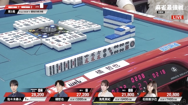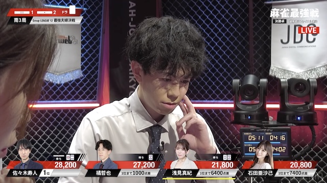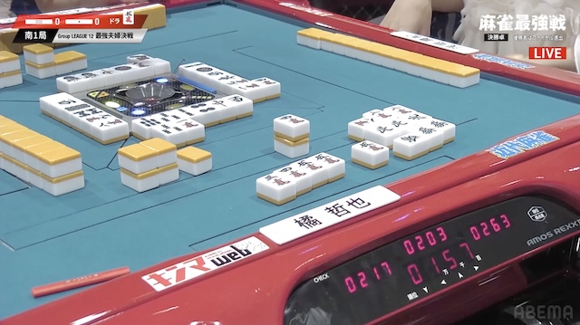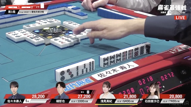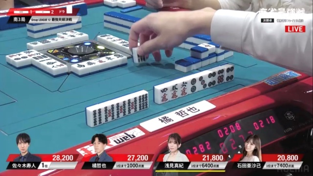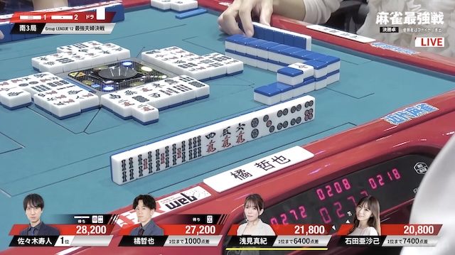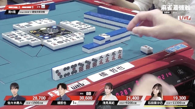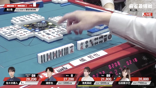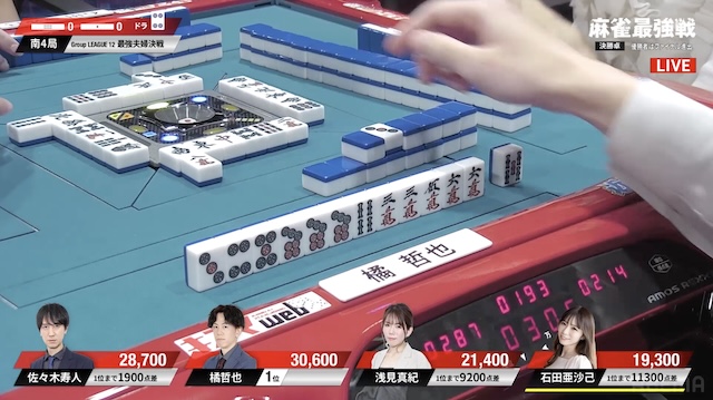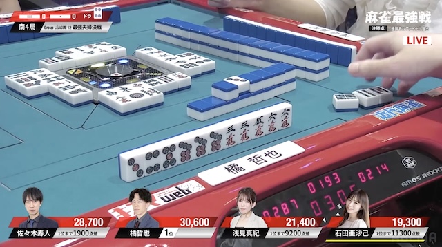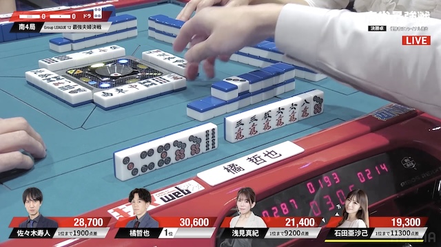 待ちテンパイになると、寿人に追いつかれるものの浅見から1300は1900の出アガリ。ここに供託3000点も加えたことで、橘はトップ目でオーラスを迎える。