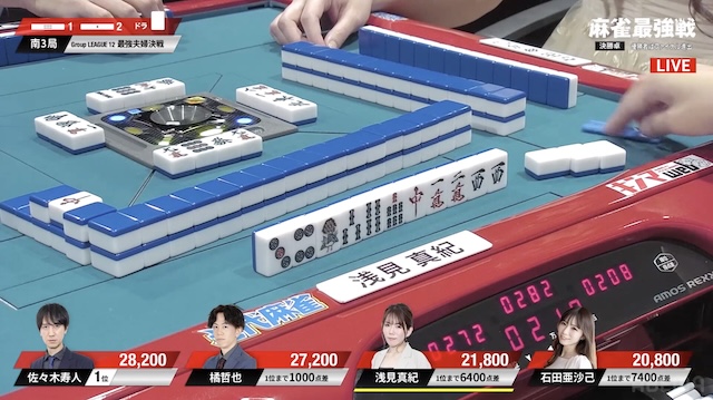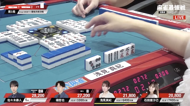 これで浅見は12000以上の高打点が確定、アガれれば、供託2本も含めてかなり決定打となりそう。