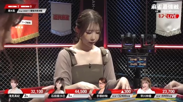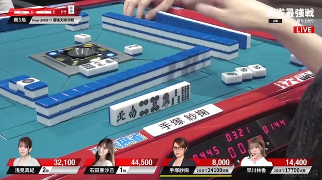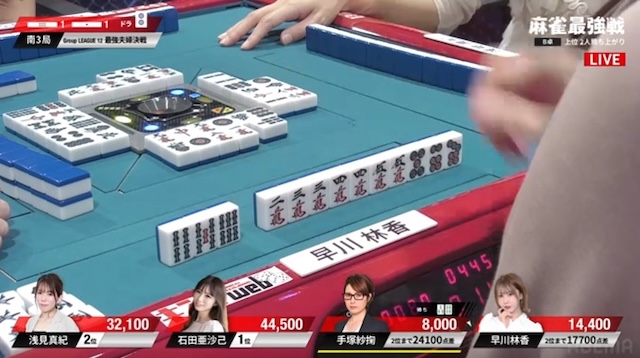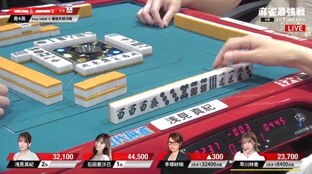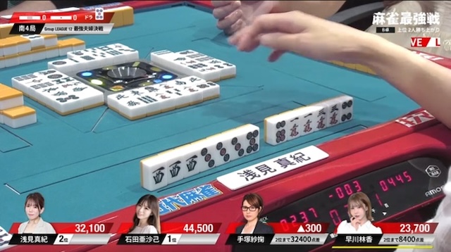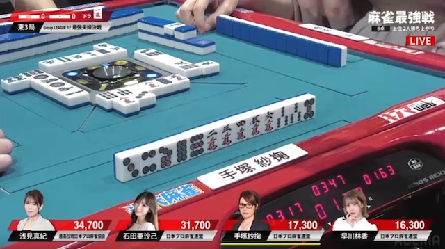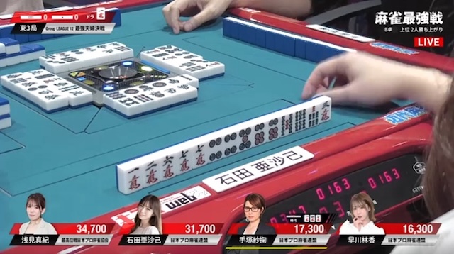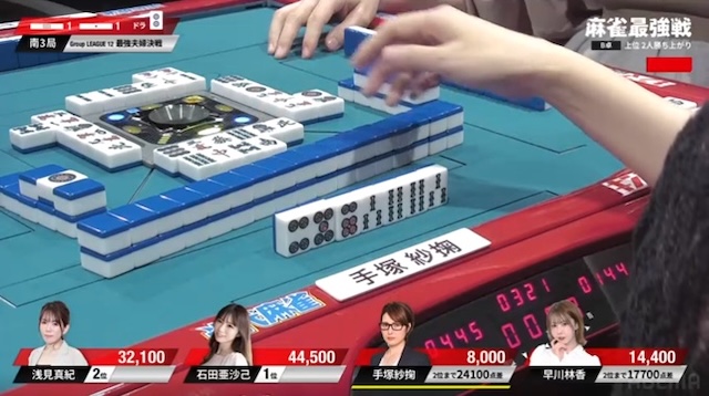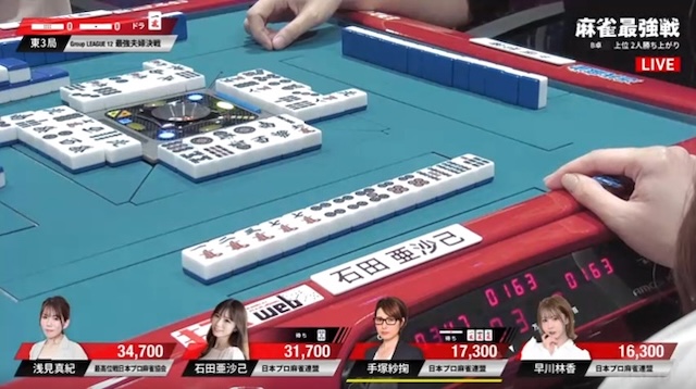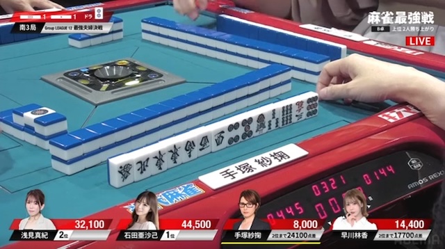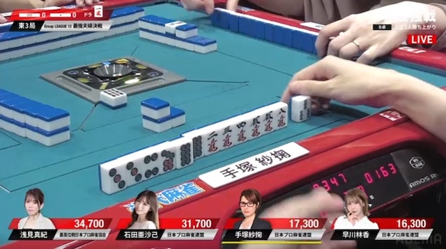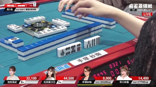 先ほどの早川に続き、手塚も3面張のリーチが交わされる厳しい展開。負けている二人に、逆風が吹き続けている。