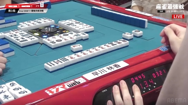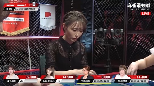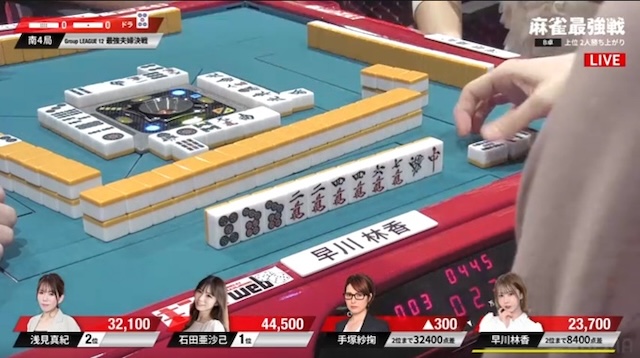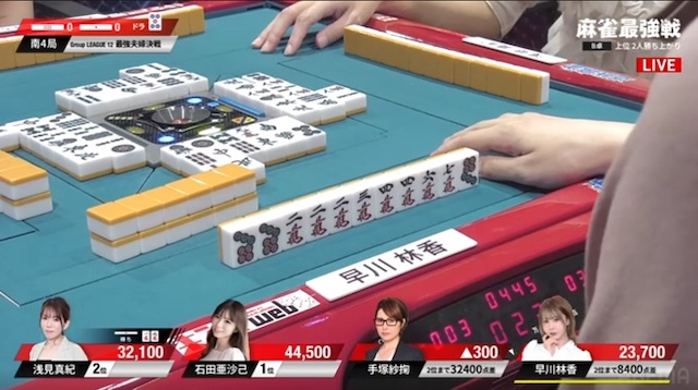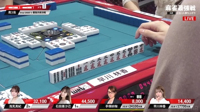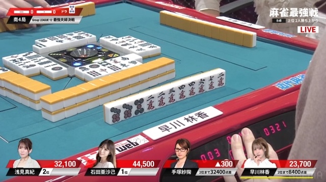 迎えた南4局。厳しい展開が続いていた早川だが、南3局の8000点加点により、勝ち上がり条件まで残り8400点。ここで敗れれば、A卓の渋川難波とともに夫婦そろって敗退となるため、何としても勝ち上がりたい。