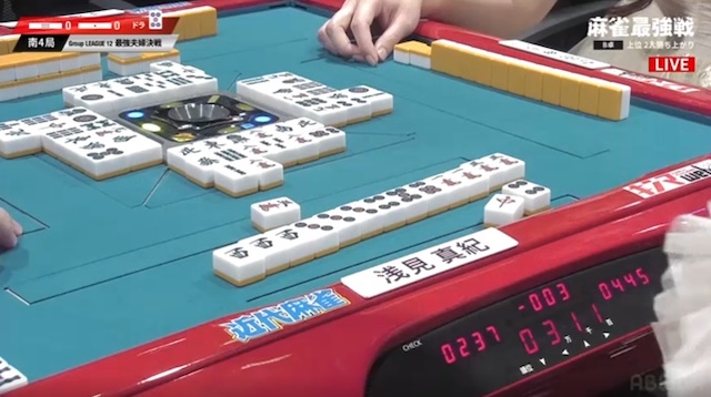 南2局が流局となり迎えた南3局1本場。親の手塚は、ここを落とすと勝ち上がり条件が一気に厳しくなる。A卓では夫・佐々木寿人がすでに勝ち上がっており、夫婦対決の舞台を実現させたいところ。