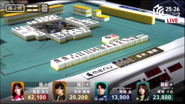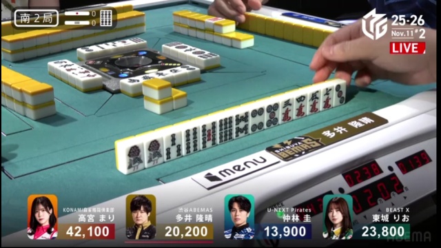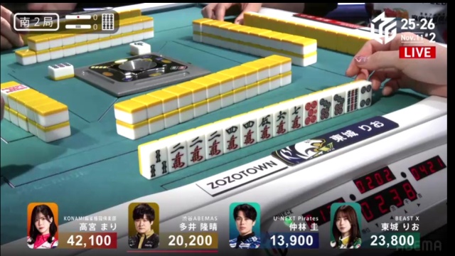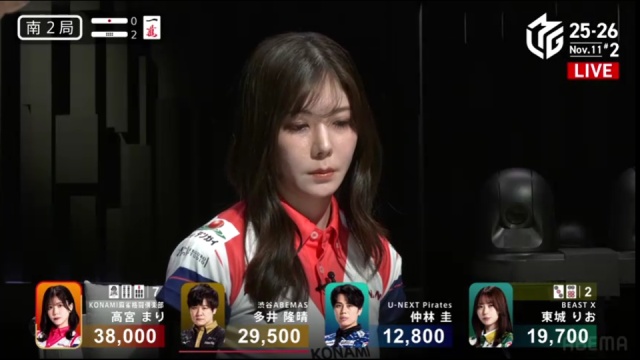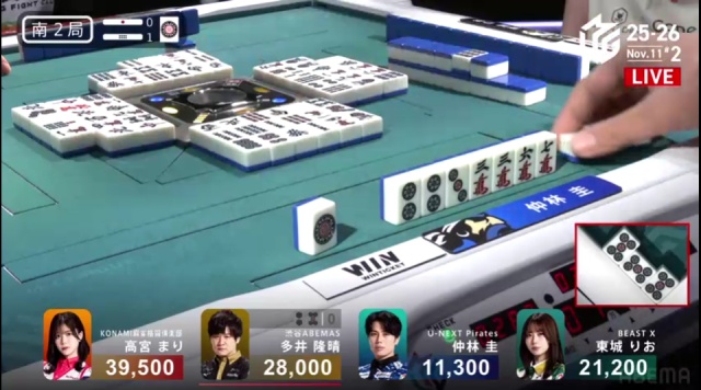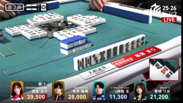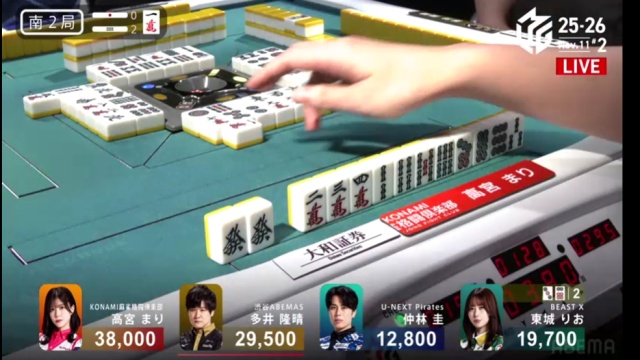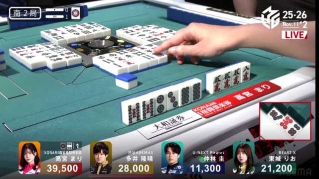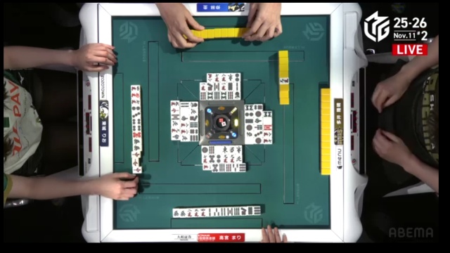 追いすがる女性陣に競り勝ち、これを三色のつかない安目ながらツモると、リーチ・ツモ・ピンフ・ドラ。裏も乗らず2600オールにしかならなかったのは不満だが、それでもトップへの挑戦権を得る。