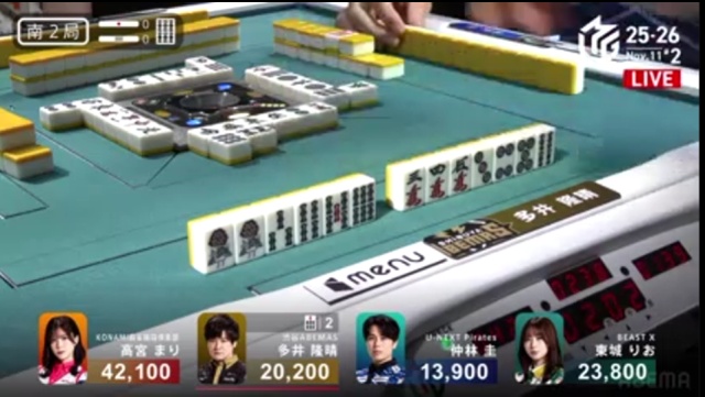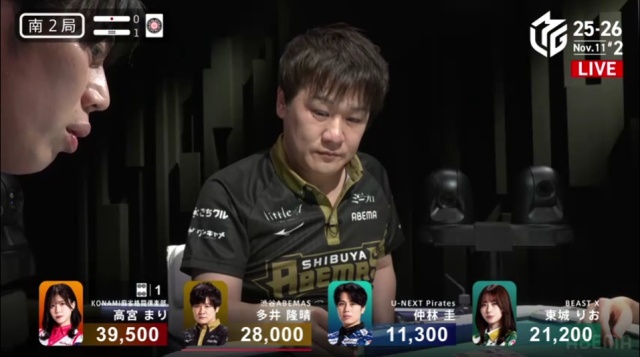 前局、先制リーチからリーヅモの500-1000を決めて30000点台に乗せた多井。