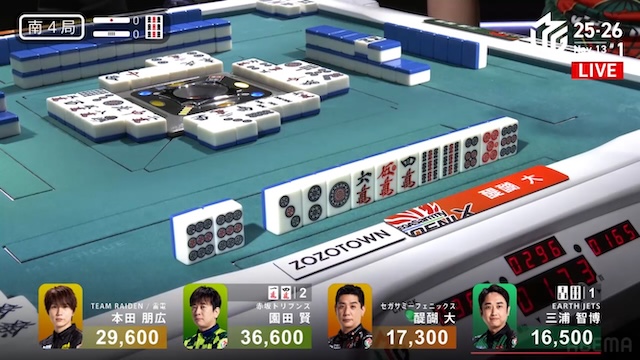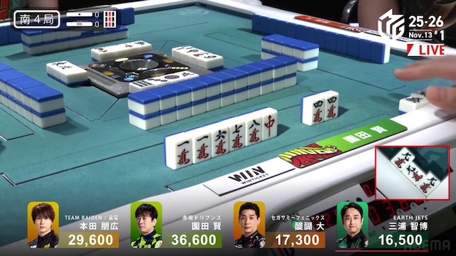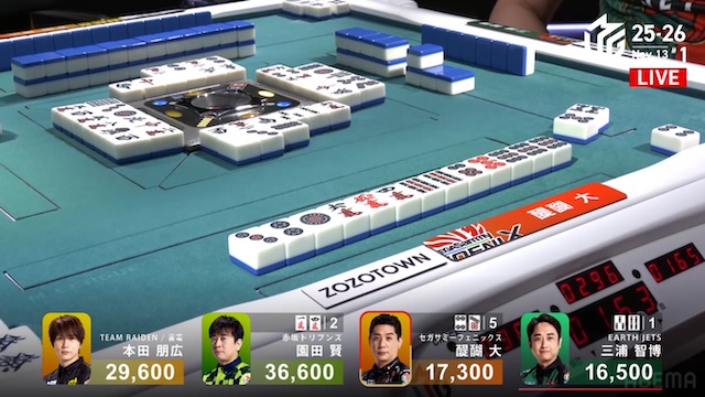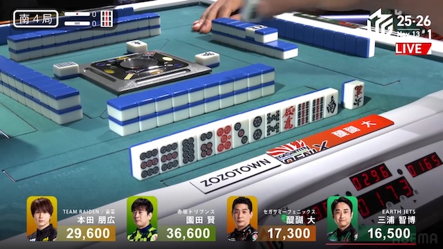 醍醐は3着目。3着と4着の点差はわずか、トップまで届くには倍満ツモが必要。
