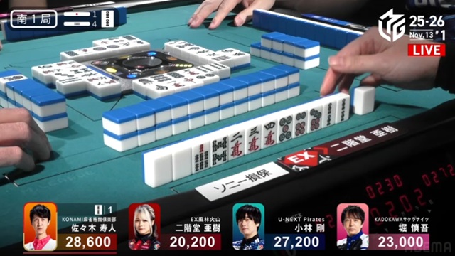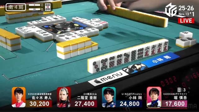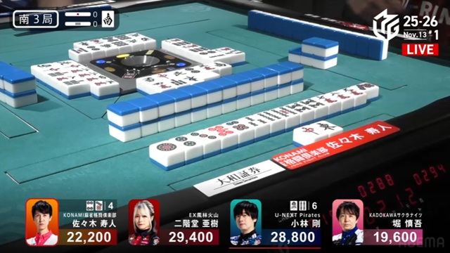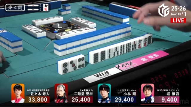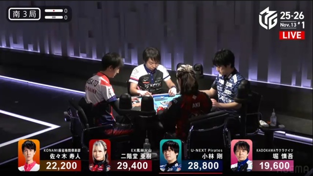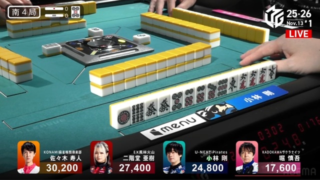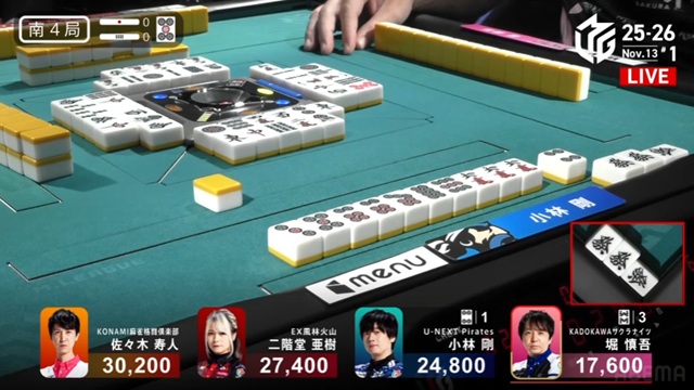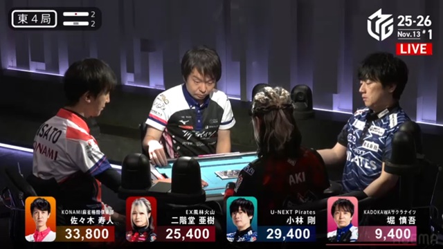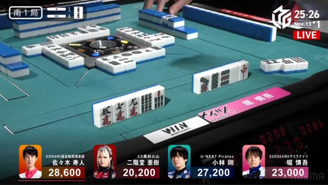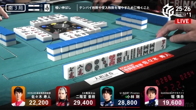 しかし、枚数で劣る寿人が一発ツモ。リーチ・ピンフ・ツモ・一発・赤で2000-4000のアガリを決めた。小林は、またしても寿人とのめくり合いに敗北。本人は「悪い偶然が続いている」と感じているだけかもしれないが、U-NEXT Piratesの楽屋では、メンバー全員が悔しがっている光景が目に浮かぶ。