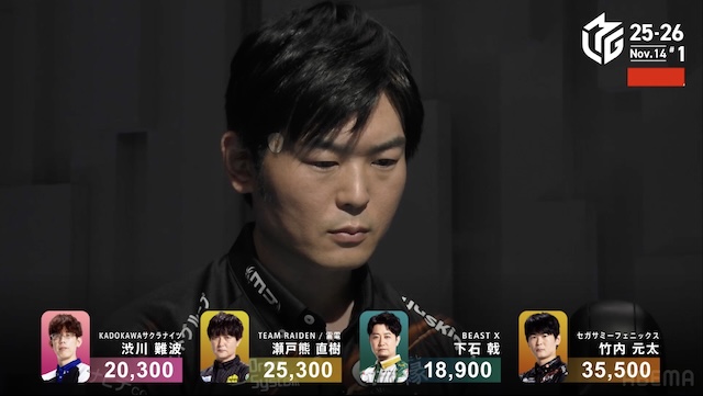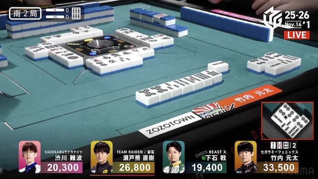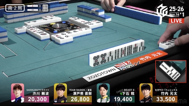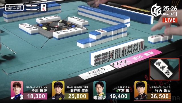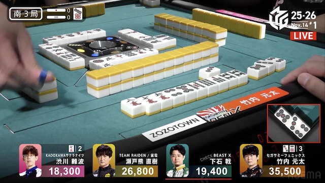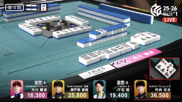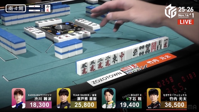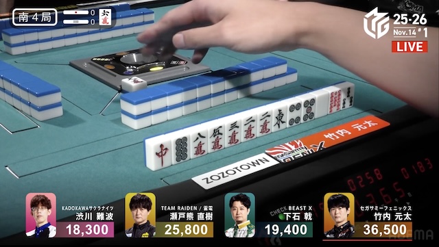 南3局も1000点のチーテンを取って瀬戸熊から出アガリ。オーラスが自身の親番であるなら、子の満貫ツモを消せる12000点差をひとつの目安とする考えはあるが、それを目指すあまりアガリを逃して相手にリードを詰められたら元も子もない。この辺は非常にリアリスティック、明るい彼のキャラクターにそぐわない言葉を使うならば「冷徹」だ。