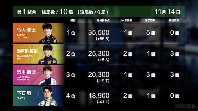 この日のスタッツを見ると、試合がまさに元太の勝ちパターンだったことがうかがえる。10局中5局もアガりながらリーチは東1局の1回のみ、そして放銃はなし。もちろん彼にだって、高打点のリーチをアガって気持ち良く勝ちたい思いがないわけではない。しかし、それは手牌が良かったときの話。この日の元太の手はトータルで見てそこまで良いわけではなかったが、そうした中でもクレバーに立ち回って失点を抑える麻雀が、山登りの過程とダブって見えた・・・のは気のせいか。