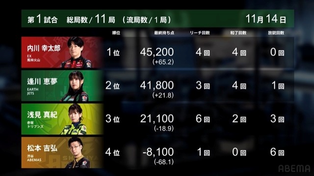 内川は松本から合計4回のアガリをものにしてトップを奪取。