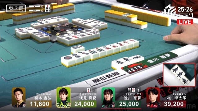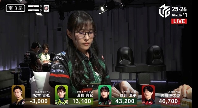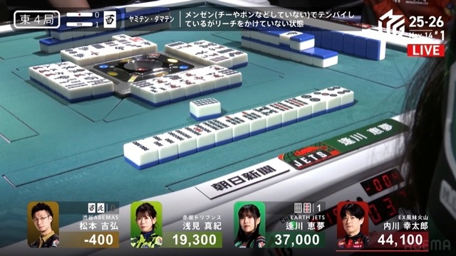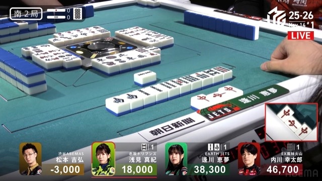 ホンイツの3,900点を浅見から直撃と、浅見の点棒が逢川へどんどん流れていった。