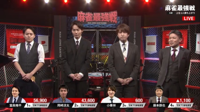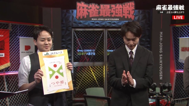 その模様はAbema麻雀チャンネルにて生配信され、B卓からは當眞脩平プロ・岡崎涼太プロが勝ち上がった。また1位勝ち上がりを決めた當間プロにはJA山形より、つや姫5kgが贈られた。