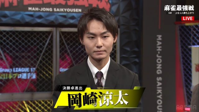 ▲B卓2位勝ち上がり・岡崎涼太プロ