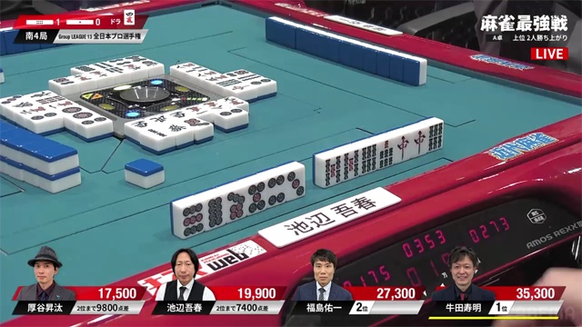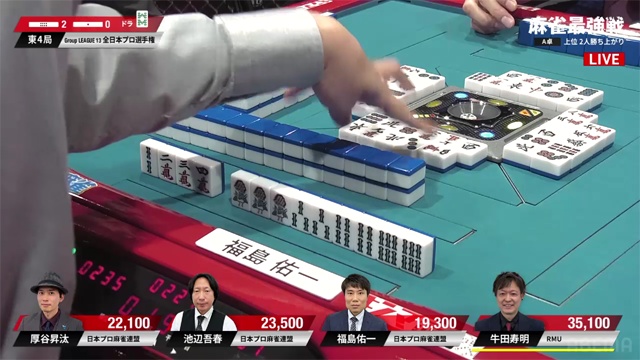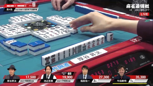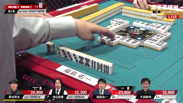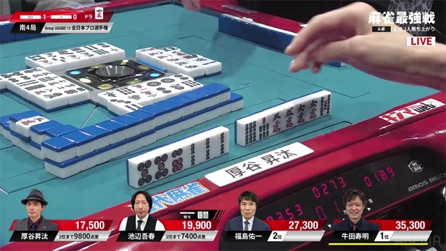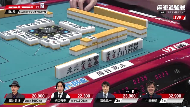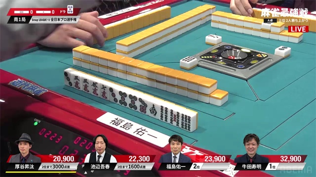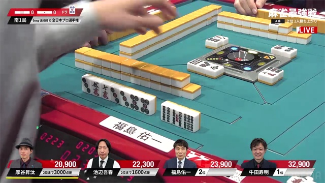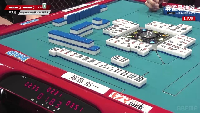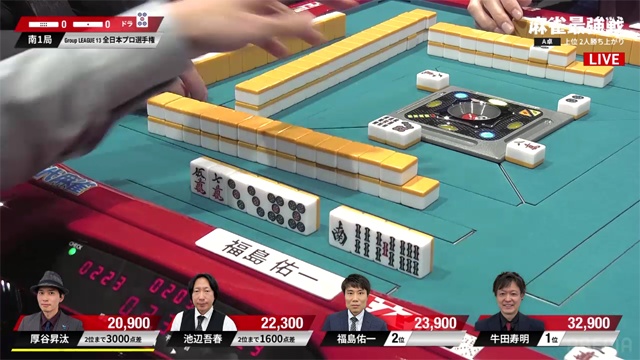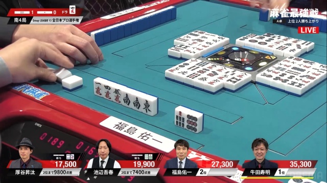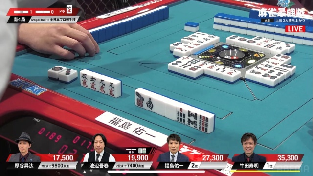 福島は親のリーチに押し切り、3900のアガリ。リーチ棒を含め、4900点の加点となった。
