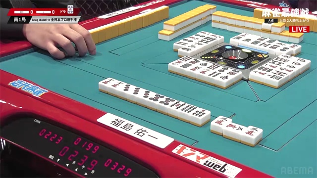 東4局2本場、長くイーシャンテンが続いた福島は11巡目にテンパイ、先制リーチを打つ。