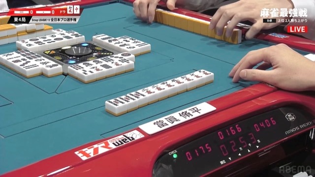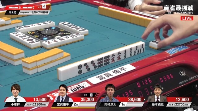 リーチツモ三色の2,000-4,000をアガって岡崎に肉薄。