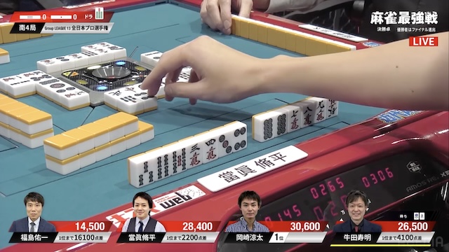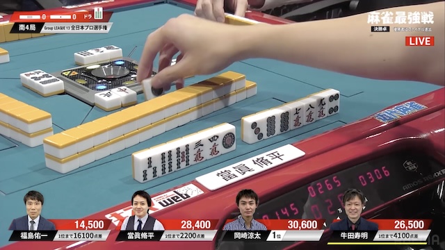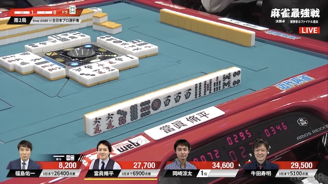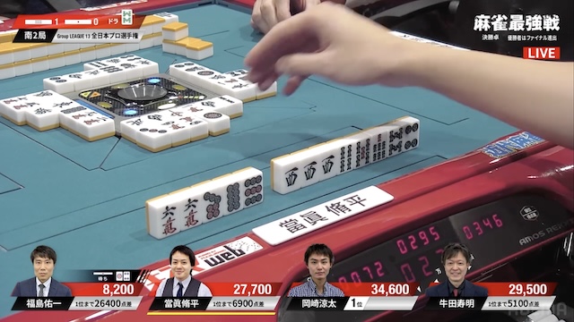 偶然役で2翻アップして8000の加点は、福島にとって上々の結果。これでまだトップを目指せる。