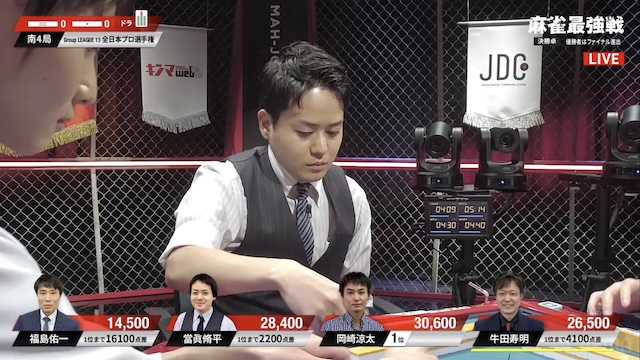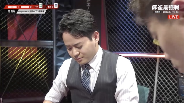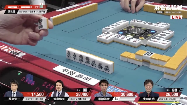 放銃を「これが敗着か」と振り返った。序盤から細かいアガリを積み重ねながら、牛田、岡崎に大物手を決められ、極めつけは4着目の福島に満貫を放銃しての親落ち。典型的な負けパターンと言える。