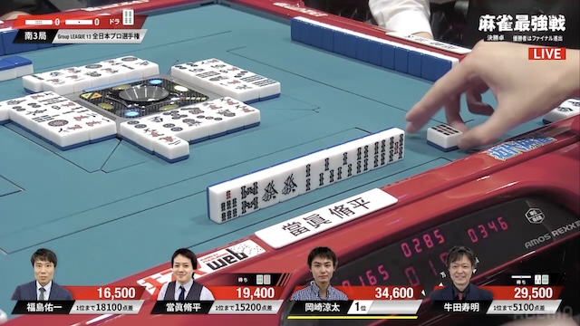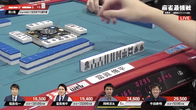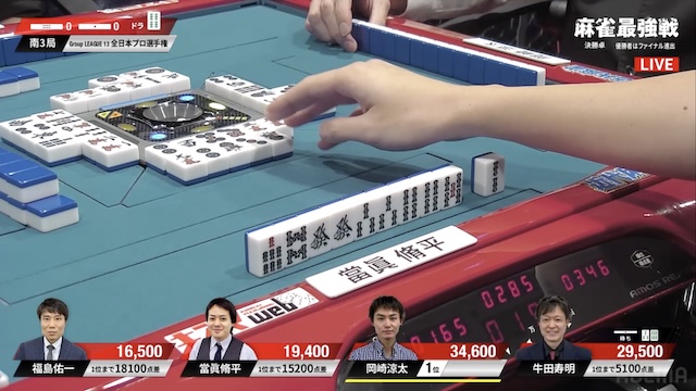 テンパイ後、鳴いていてもリーチモーションになる牛田、その左手に訪れたのは、當眞のラストピースだった。