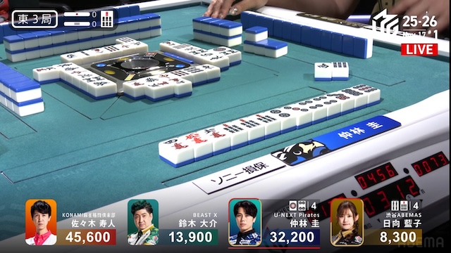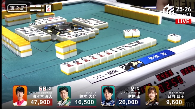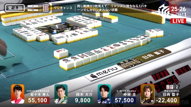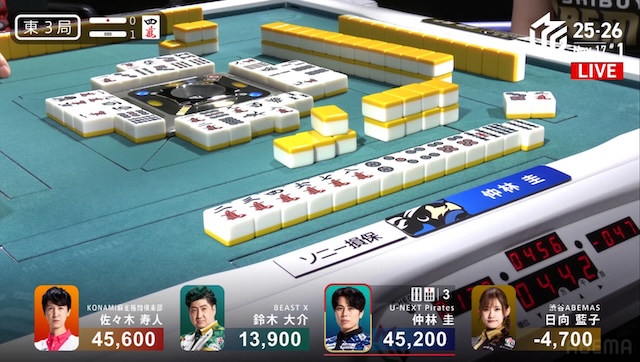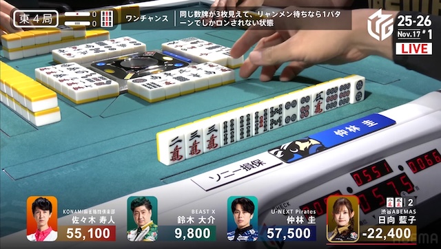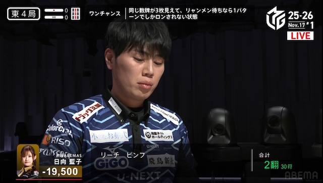 更に迎えた東3局、親番で勝負手が入った仲林は、リーチの日向にドラ