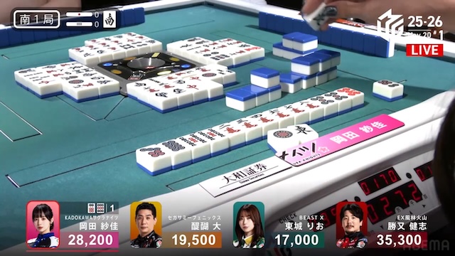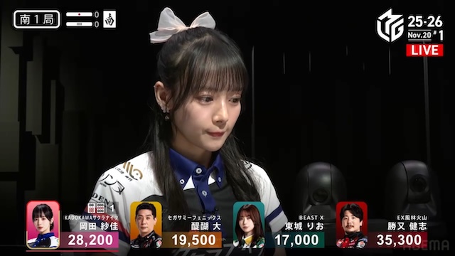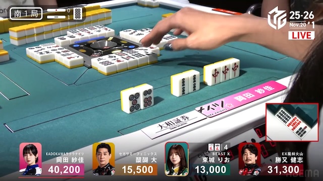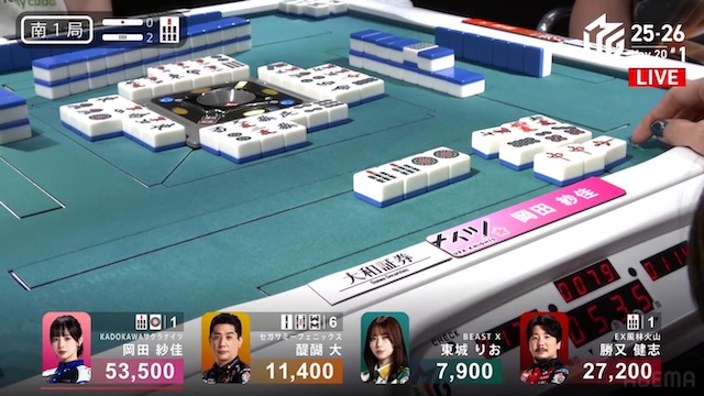 今季まだトップのなかった岡田にとって、ついに掴んだ初トップ。親番での勝負も見事に活かし、南1局から続いた連続のアガリで着実にリードを広げた。