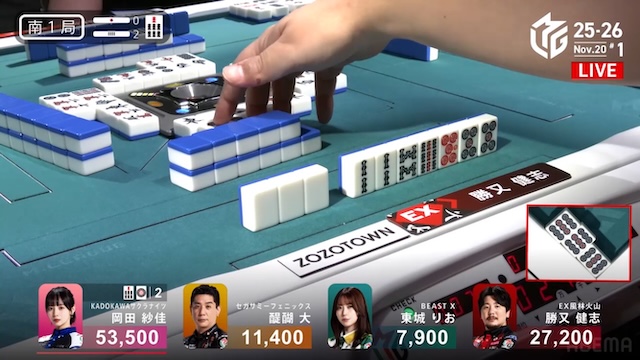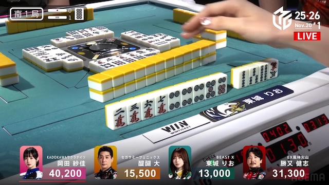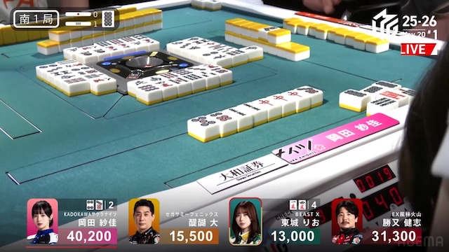 リーチツモタンヤオ赤の4000オールを決め、親番でのアガリから続く流れを生かす。今季まだトップのない岡田にとって、このツモアガリは勢いを本格的につかむ大きな一手だった。