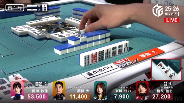 ドラ3赤の満貫テンパイとなり、場の緊張感は一気に高まった。結果は岡田が