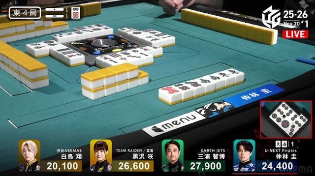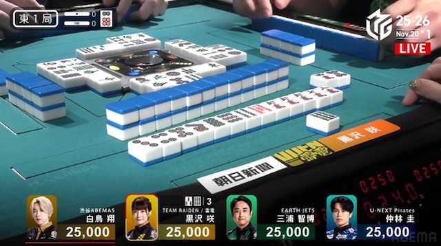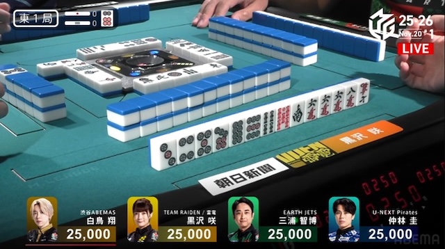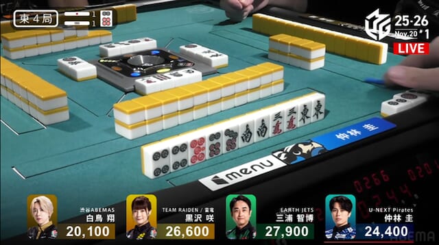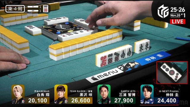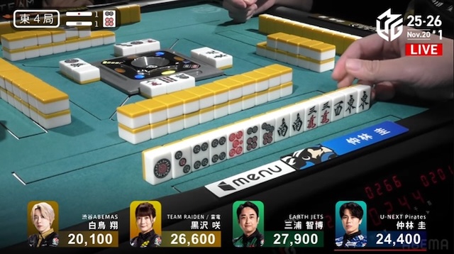 東2局は、三浦のリーチに対して黒沢が副露で応戦するも、三浦が1300-2600のツモアガリ。東3局は仲林のリーチが入り、流局を挟んで迎えた東4局。