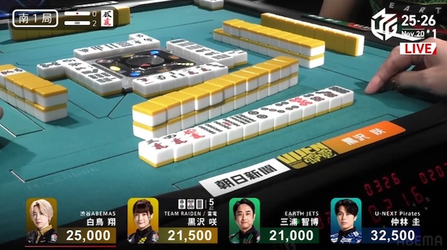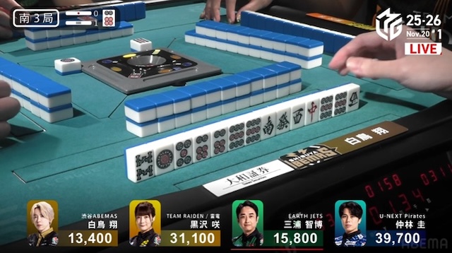 が放たれ放銃。黒沢が8000点のアガリを決め、トップ目の仲林にじわりと迫る一撃となった。