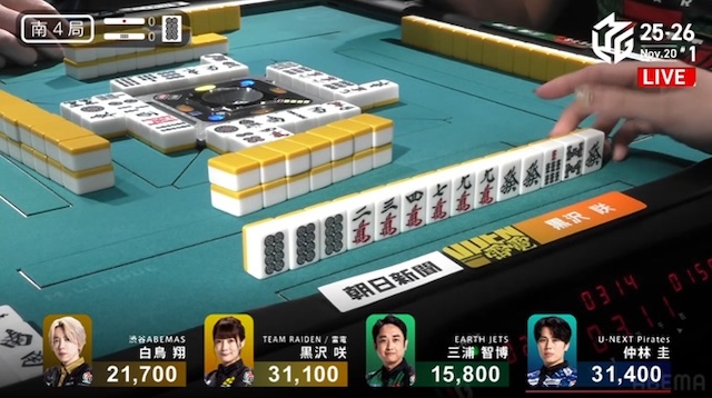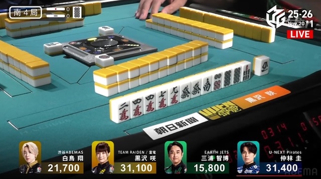 南3局で満貫を放銃した仲林だが、依然として黒沢と300点差のトップ。白鳥は満貫ツモでトップ、三浦は跳満ツモで2着浮上が見える状況。仲林にとっては、誰がツモっても2着に転落、放銃すれば3着もあり得るという、押し引きの難しい局面だった。